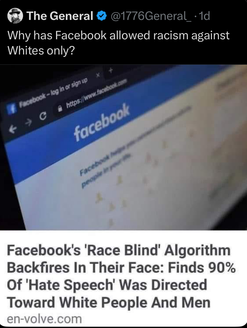 GNR_RadioEnglish · 3 days agoFacebook’s 'Race Blind’ Algorithm Shows At Least 90% Of Hate Targeted Men & White Peopleen-volve.comexternal-linkmessage-square0linkfedilinkarrow-up11