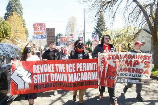Portland, OR – On April 4, angry protesters marched to Portland Mayor Keith Wilson’s house, demanding he revoke the conditional land use permit for the ICE detention facility. The protest, organized by Portland Contra las Deportaciones (PDXCD), began at Wilshire Park and drew a crowd of over 50 in front of the mayor’s home.