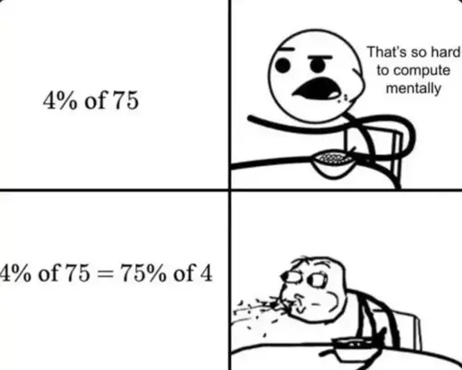 That’s a neat trick but also 4% of 75 = (1% of 75) * 4 = 0.75 * 4 = 1.5 * 2 = 3