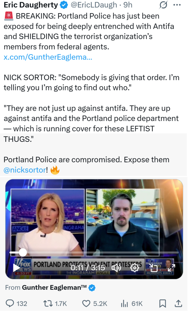“They are not just up against antifa. They are up against antifa and the Portland police department — which is running cover for these LEFTIST THUGS.”