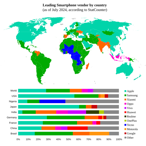 Across the world, the biggest smartphone manufacturers are Apple (28%), Samsung (24%), Xiaomi (12%), Oppo (6%) and Vivo (5%). However, there are geographic patterns in popularity, with Apple dominating North America and East Asia, while Samsung leads in South America, Europe, Africa and West Asia in addition to its home turf of South Korea. Xiaomi is the most popular phone brand across South Asia, Spain, Venezuela, Ukraine, Madagascar, Kyrgyzstan and Palestine, while Tecno is popular in West and Central Africa. Oppo, Vivo and Huawei lead in Indonesia, Bhutan and Togo respectively.