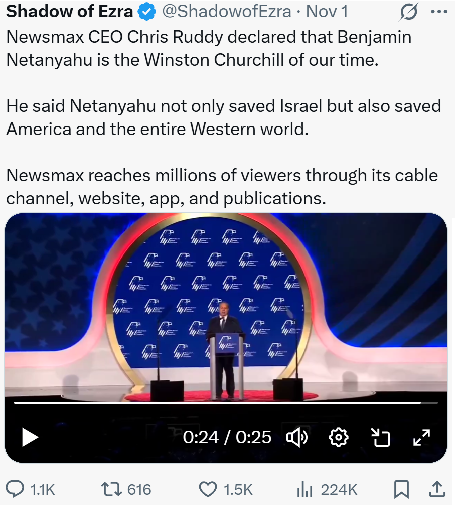 QuantumTickle to Conservative and Conservative2@lemmy.todayEnglish · 12 hours agoNewsmax CEO Chris Ruddy declared that Benjamin Netanyahu is the Winston Churchill of our time.plus-squarex.comexternal-linkmessage-square0linkfedilinkarrow-up11